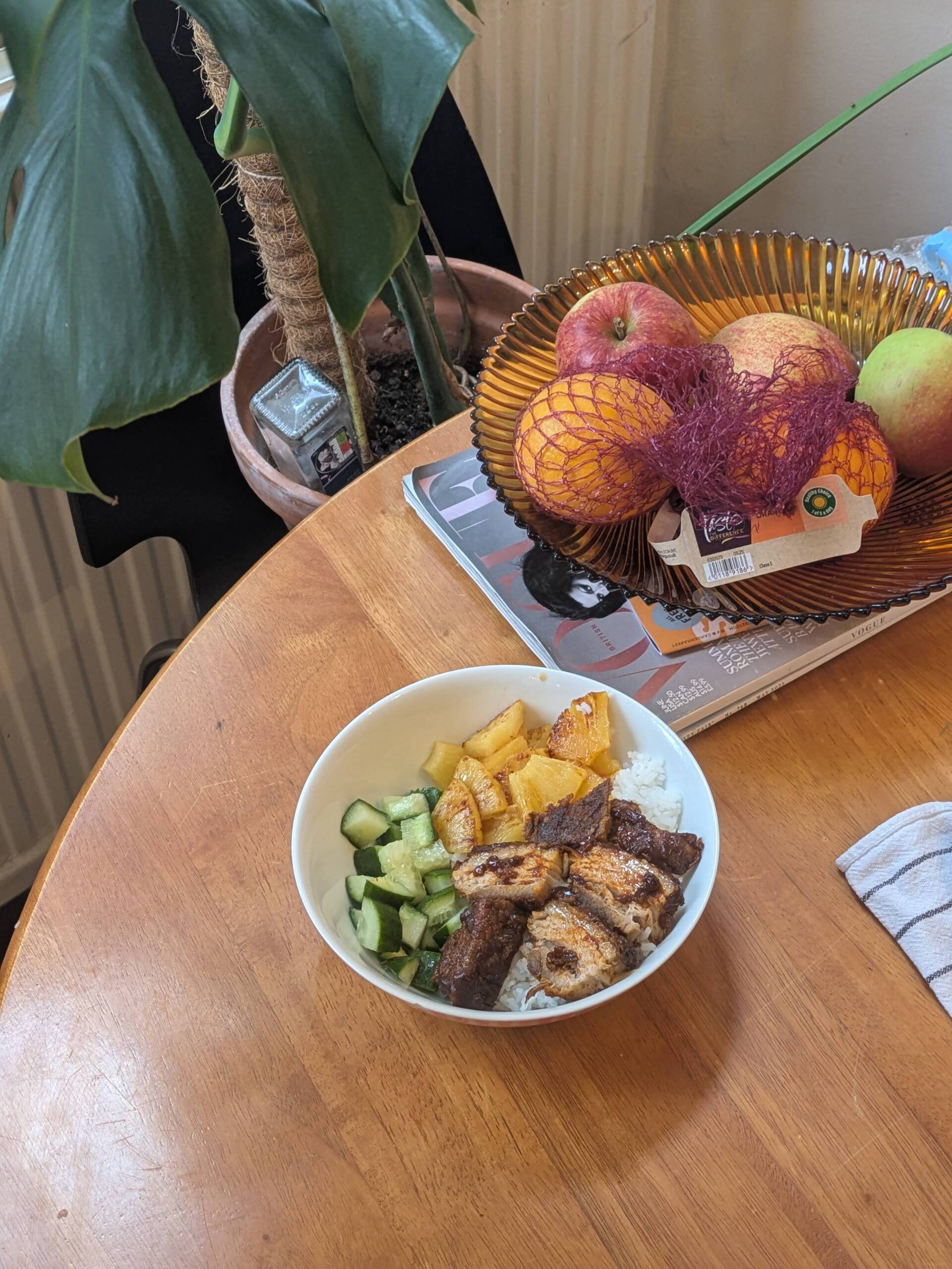 I also made a nice lunch, a repeat of a meal I made earlier in the week with some pork belly (scored on the cheap as part of a deal in Sainsbury’s), pineapple, cucumber and rice. I’ve never been much of a cook (as those of you who lived with me in Japan can attest), mostly because I’m rubbish at meal planning, but I’m enjoying building a repertoire of easy and tasty meals in my new environment. I think the biggest realisation I’ve had with this recently is you don’t have to be a culinary masterpiece overnight, you can build gradually, recipe by recipe.