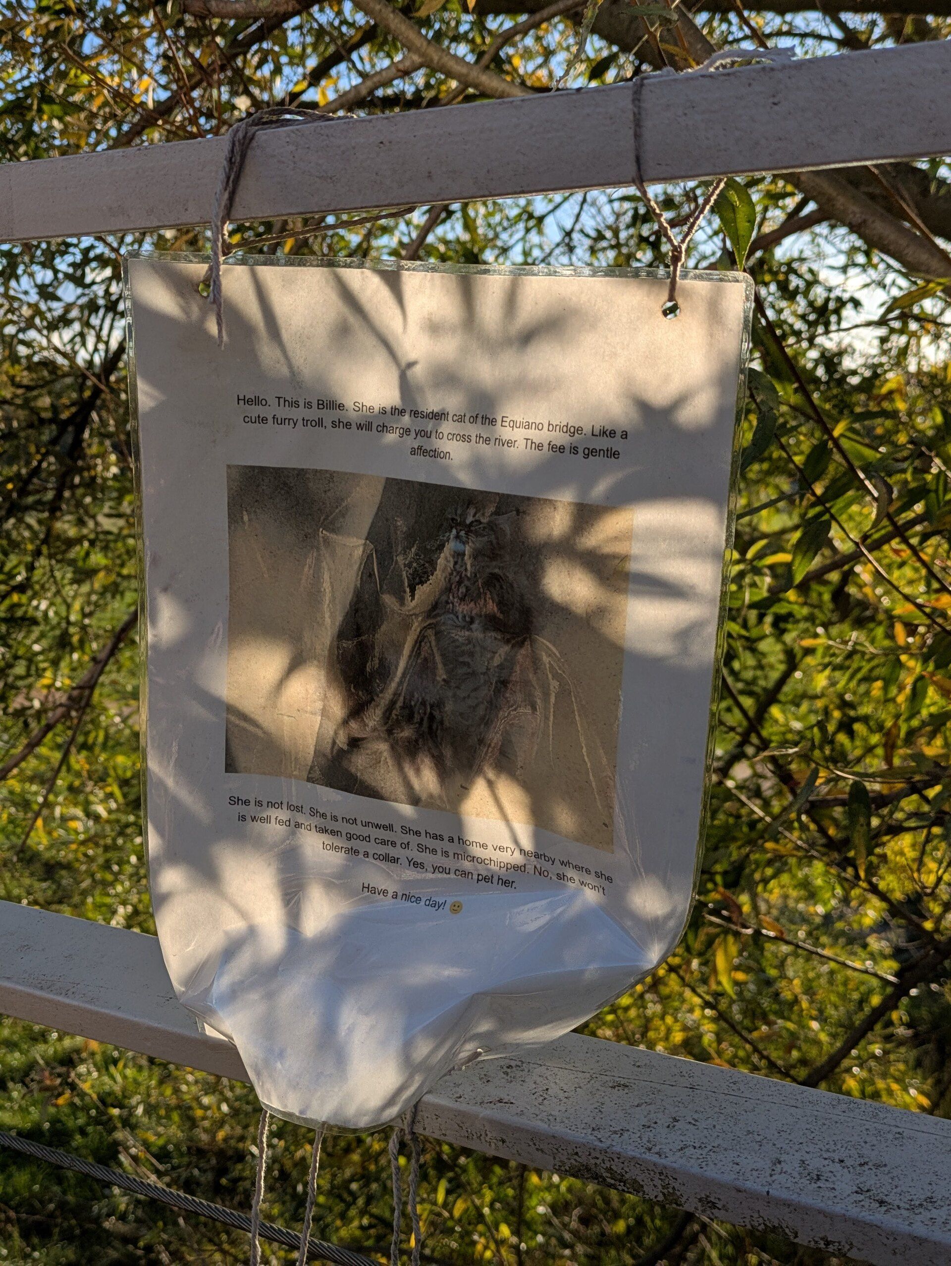 a poster about a cat spotted on our walk, except she’s not missing, she’s just the resident troll of the bridge <3